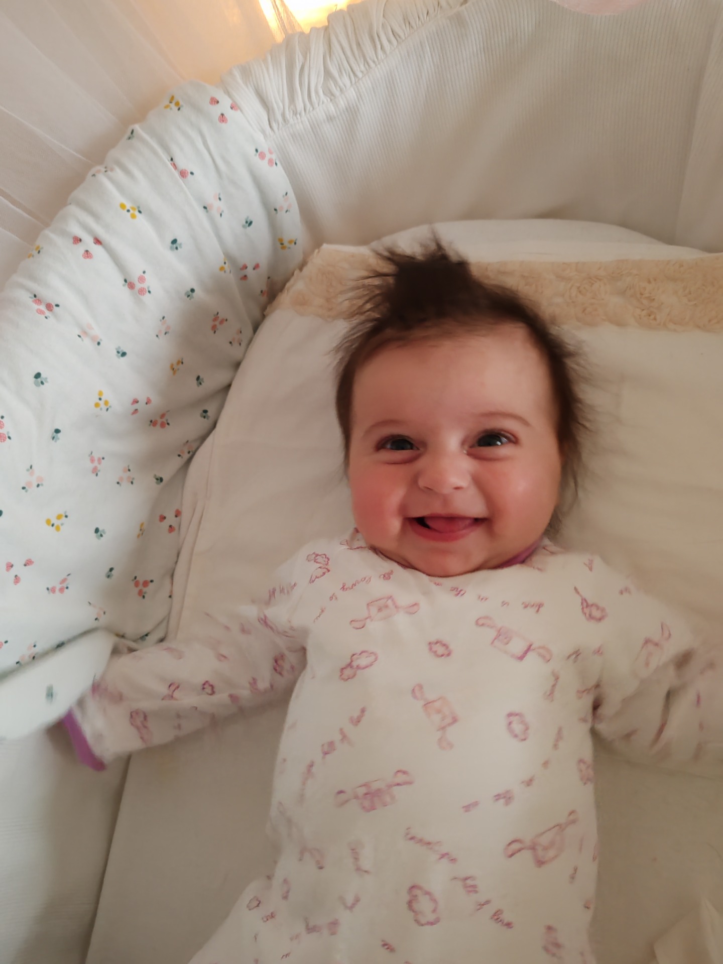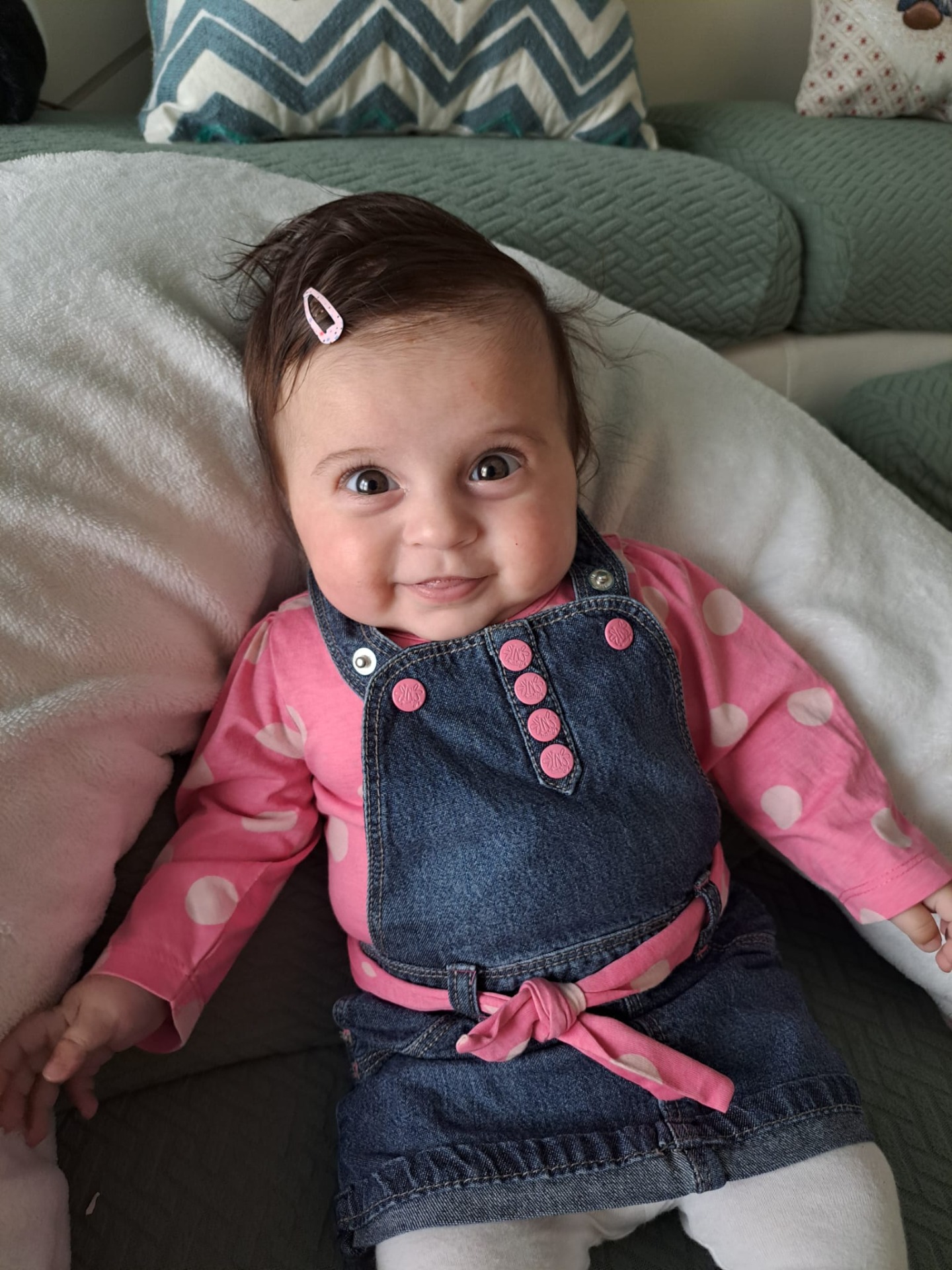 Nora attualmente ha 4 mesi, pesa quasi 7kg ed è lunga 66cm; quindi, se pensavate di regalarle abbigliamento, nel dubbio puntate ad una taglia in più o anche due, che forse è meglio.